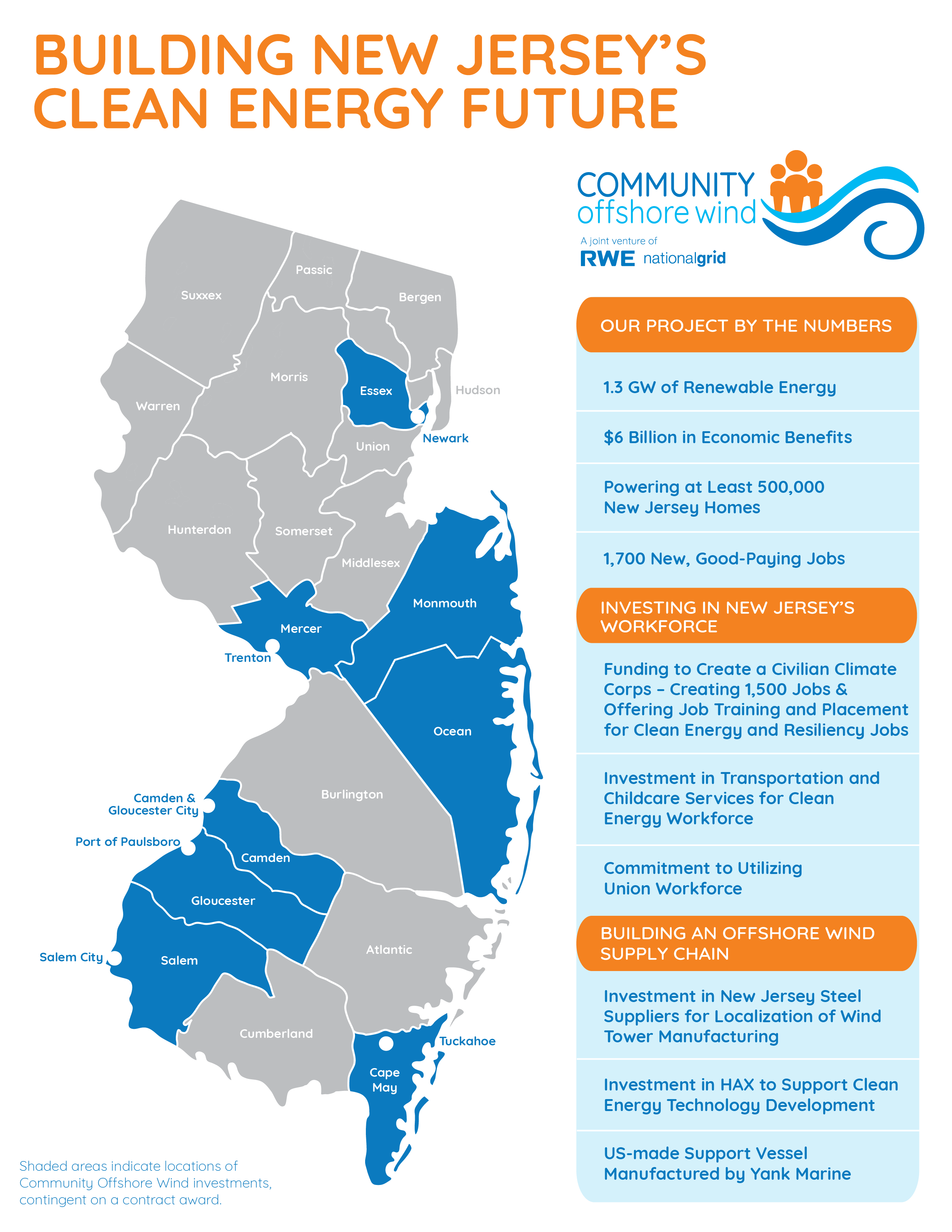 William Mullen, President of the New Jersey Building and Construction Trades Council: “The New Jersey Building and Construction Trades Council supports Community Offshore Wind’s commitments to utilize local New Jersey union construction labor. The Project will bring high-paying jobs and workforce development programming to our communities. This is a generational opportunity for the building trades to be a key player in ensuring the clean energy industry leads to family-sustaining careers for generations.”